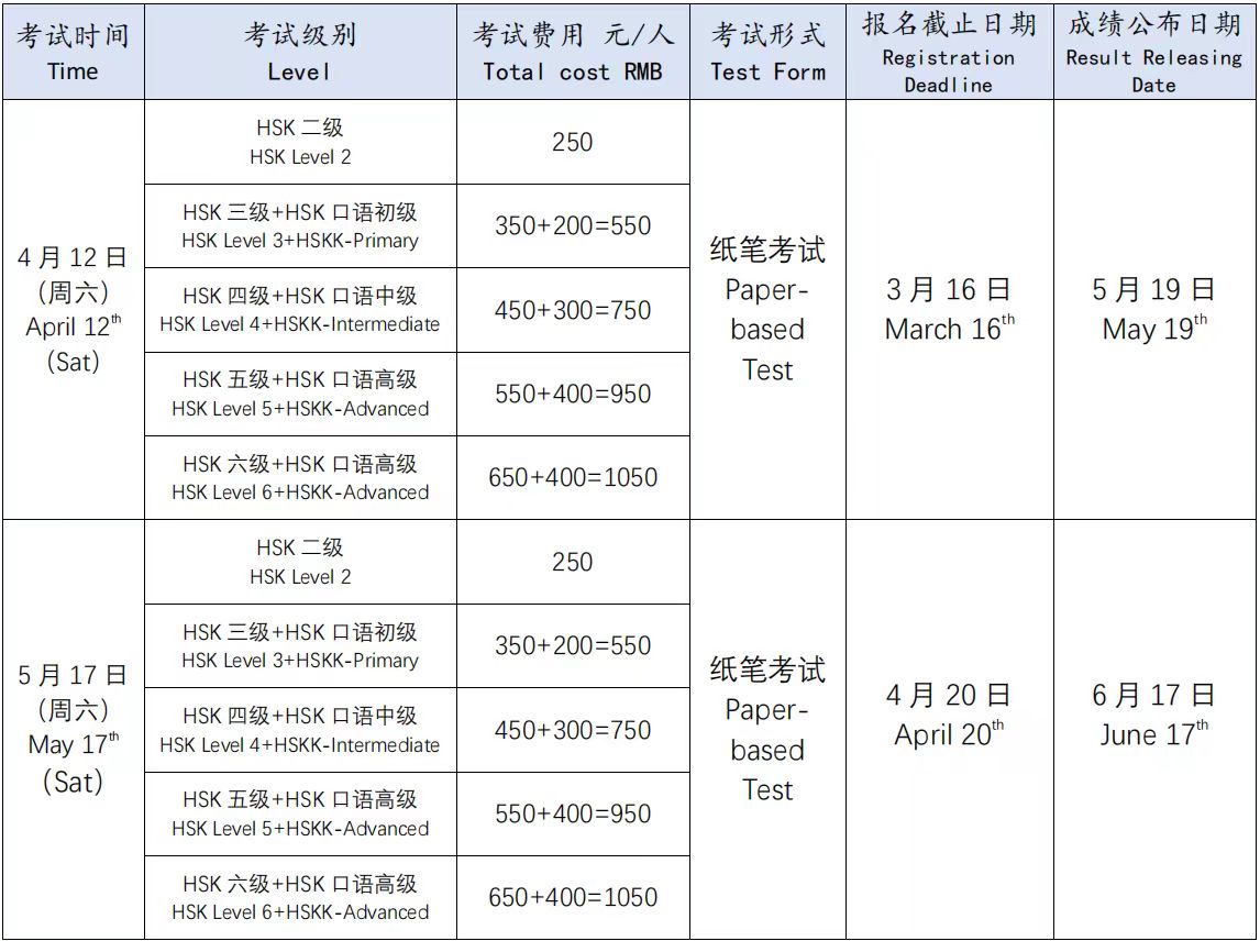 关于2025年春季学期HSK和HSKK考试报名的通知